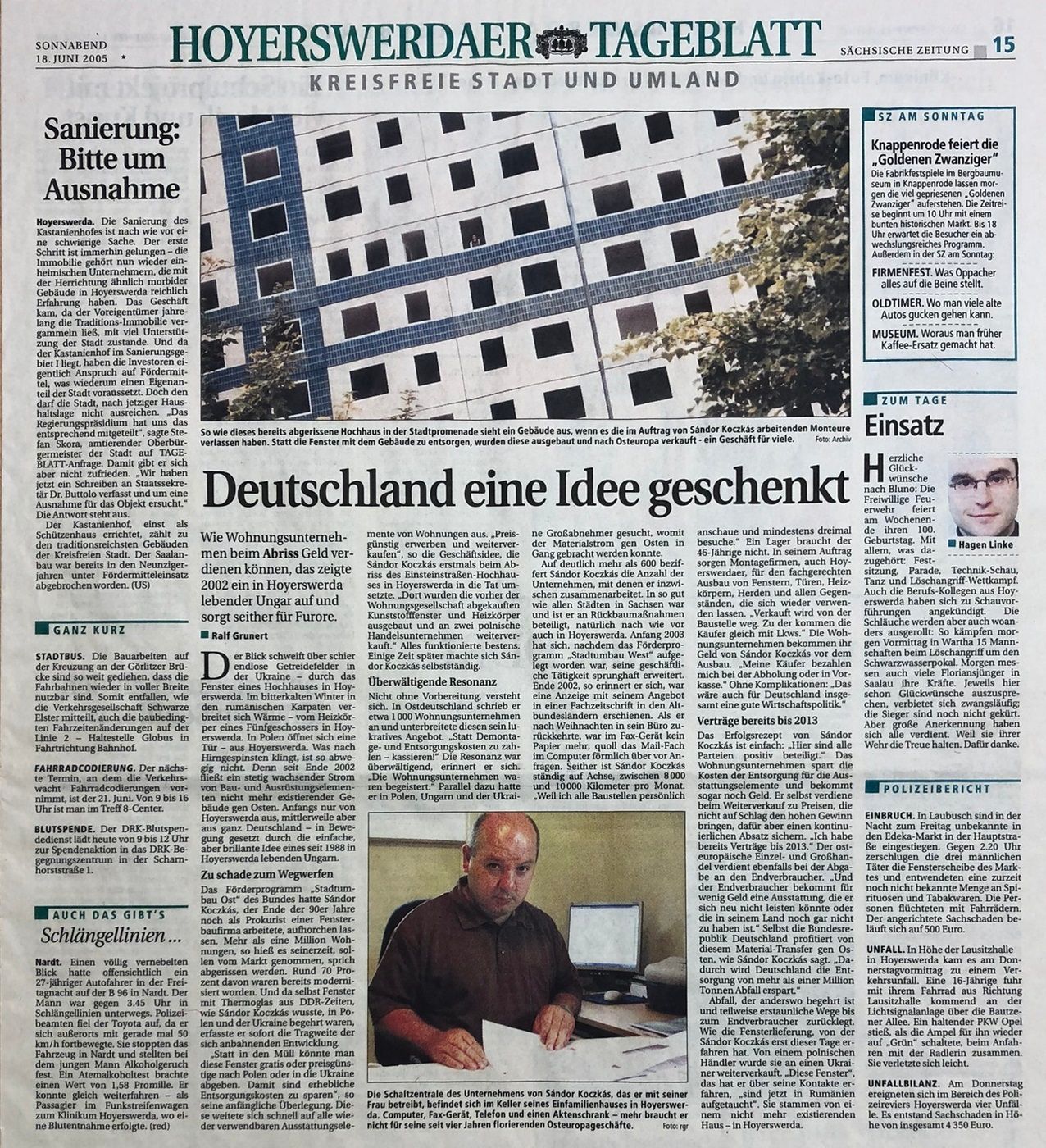 Das Förderprogramm "Stadtumbau Ost" des Bundes hatte Sándor Koczkás, der Ende der 90er Jahre noch als Prokurist einer Fensterbaufirma arbeitete, aufhorchen lassen. Mehr als eine Million Wohnungen, so hieß es seinerzeit, sollen vom Markt genommen, sprich abgerissen werden. Rund 70 Prozent davon waten bereits modernisiert worden. Und da selbst Fenster mit Thermoglas aus DDR-Zeiten, wie Sándor Koczkás wusste, in Polen und der Ukraine begehrt waren, erfasste er sofort die Tragweite der sich anbahnenden Entwicklung. "Statt in den Müll könnte man diese Fenster gratis oder preisgünstig nach Polen oder in die Ukraine abgeben. Damit sind erhebliche Entsorgungskosten zu sparen", so seine anfängliche Überlegung. Diese weitete sich schnell auf alle wieder verwendbaren Ausstattungselemente von Wohnungen aus. "Preisgünstig erwerben und weiterverkaufen", so die Geschäftsidee, die Sándor Koczkás erstmals beim Abriss des Einsteinstraßen-Hochhauses in Hoyerswerda in die Tat umsetzte. "Dort wurden die vorher der Wohnungsgesellschaft abgekauften Kunststofffenster und Heizkörper ausgebaut und an zwei polnische Handelsunternehmenweiterverkauft." Alles funktionierte bestens. Einige Zeit später machte sich Sándor Koczkás selbstständig.